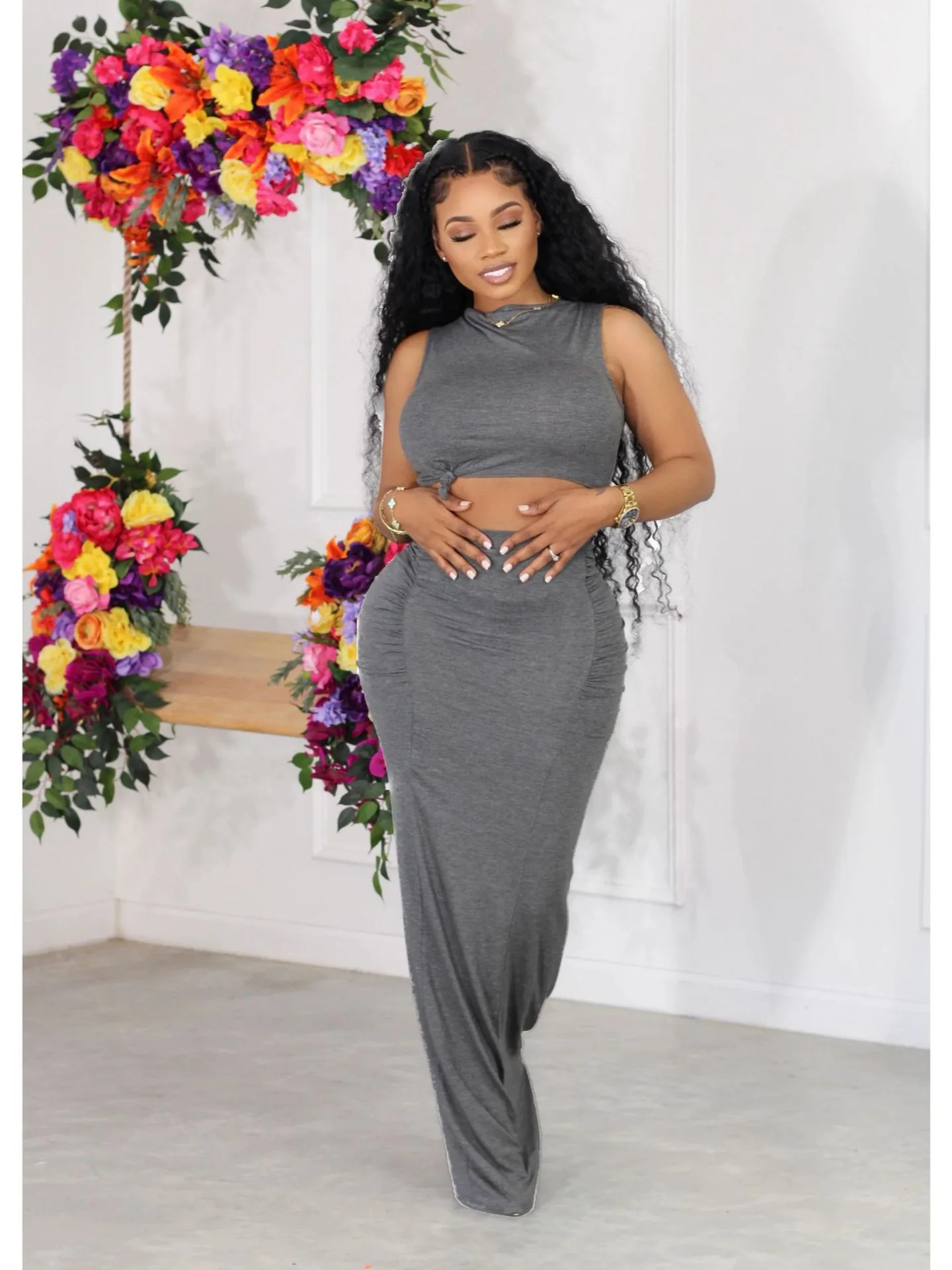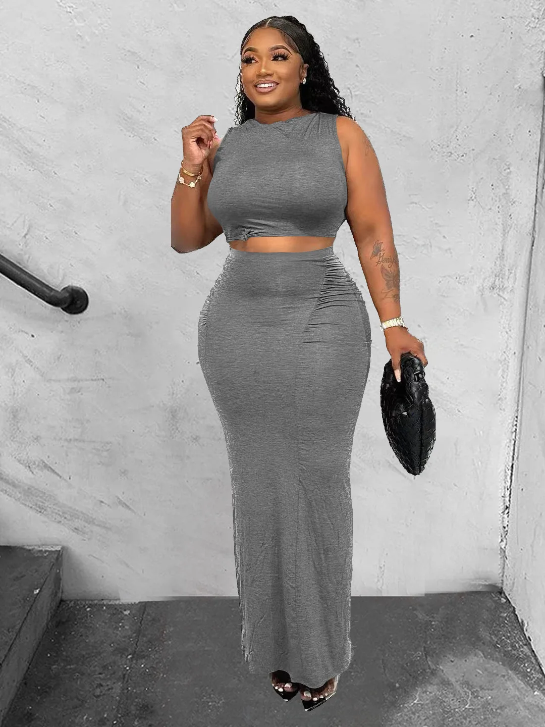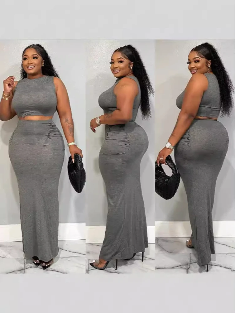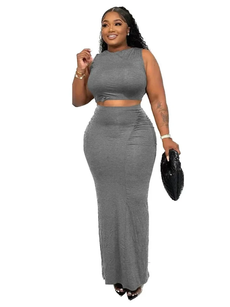 Solid Color Simple Long Women’s Hip Skirt Sexy Slim Two-Piece Set Summer New Casual Navel Sleeveless Round Neck Short Vest Tops